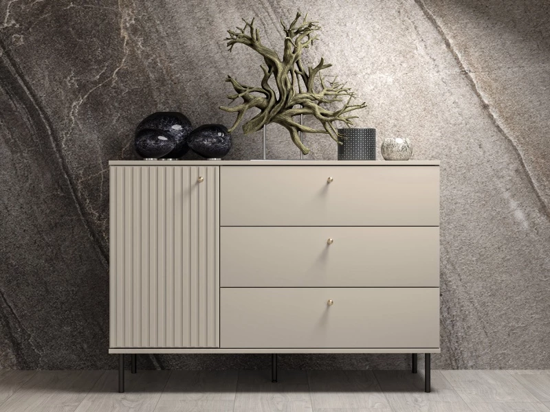 Komoda Sophie 05 to idealny mebel do przechowywania oraz ekspozycji ulubionych przedmiotów na blacie. Za drzwiami znajduje się półka dzieląca zamykaną przestrzeń na dwie pojemne wnęki. Dodatkowe trzy głębokie szuflady zapewnią odpowiednią ilość miejsca na Twoje obrusy, ręczniki czy ubrania. Komoda będzie świetnym dopełnieniem Twojego salonu lub sypialni. Nasz mebel to synonim współczesnej elegancji. Kaszmirowy dekor, frezowane fronty MDF, gałki w kolorze szczotkowanego złota oraz dyskretne czarne nóżki to kwintesencja całej kolekcji Sophie. • Funkcjonalny mebel w pięknym wydaniu. • Zwiększona ładowność szuflad, dzięki specjalnemu wzmocnieniu dna. • Szuflady z wygodnym systemem pełnego wysuwu. • Dodatkowy komfort użytkowania, dzięki zawiasom z systemem cichego domyku. • Wysokie metalowe nóżki ułatwią sprzątanie, zapewniając nieograniczony dostęp Twojemu odkurzaczowi. Meble z kolekcji Sophie to idealny wybór do współczesnego salonu czy sypialni. Dzięki systemowi złożonemu z jedenastu brył urządzisz swoje wymarzone wnętrze. Kaszmirowy dekor to niebanalny i ponadczasowy kolor, nazywany nowym białym. Frezowane fronty MDF podkreślają wyrafinowanie i elegancję całej kolekcji. Dyskretne czarne nóżki dodają bryłom efektownej lekkości. Kropką nad i, dodatkowo budującą estetykę wszystkich mebli Sophie są uchwyty ze szczotkowanego metalu, w złotym wybarwieniu.