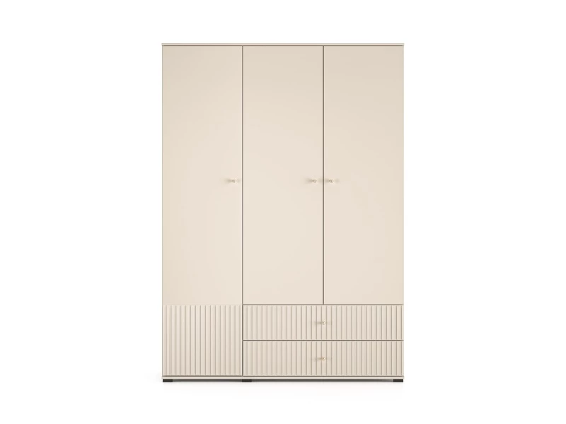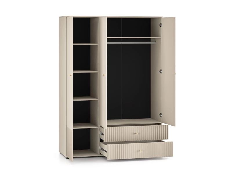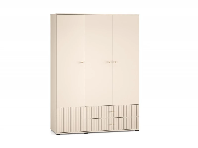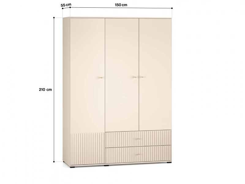 Szafa Sophie 22 to mebel, w którym przechowasz swoją odzież i dodatki. Bryła podzielona jest na trzy funkcjonalne strefy. Główną część tworzy duża przestrzeń z solidnym drążkiem, na którym powiesisz koszule, garsonki czy garnitury. Nad drążkiem znajduje się szeroka półka na kapelusze czy inne tekstylia. Lewa strona mebla składa się z pięciu pojemnych wnęk, w których, w uporządkowany sposób, przechowasz swoje ubrania lub inne przedmioty. Dolna część szafy to dwie duże szuflady, idealne na bieliznę czy skarpety. Design mebla Sophie 22 to synonim współczesnej elegancji. Kaszmirowy dekor, frezowane fronty MDF, metalowe gałki w kolorze szczotkowanego złota oraz dyskretne czarne nóżki to kwintesencja całej kolekcji Sophie.