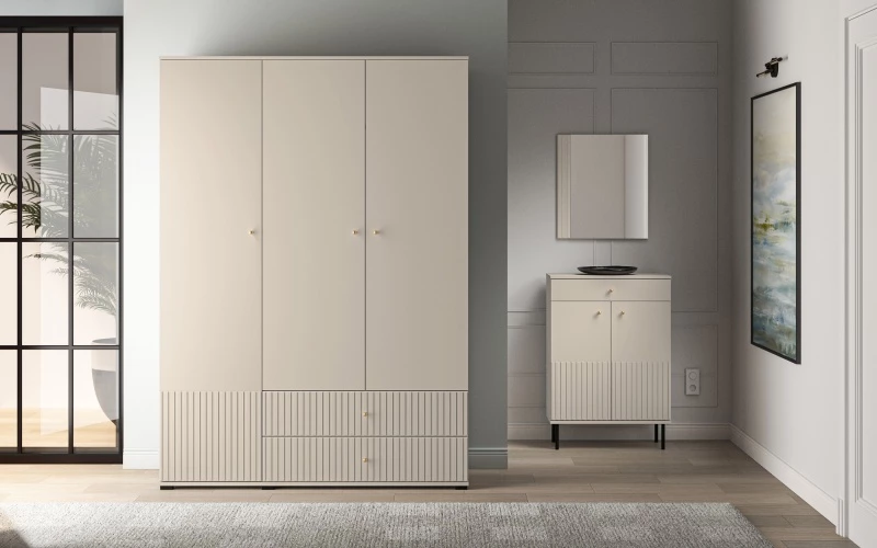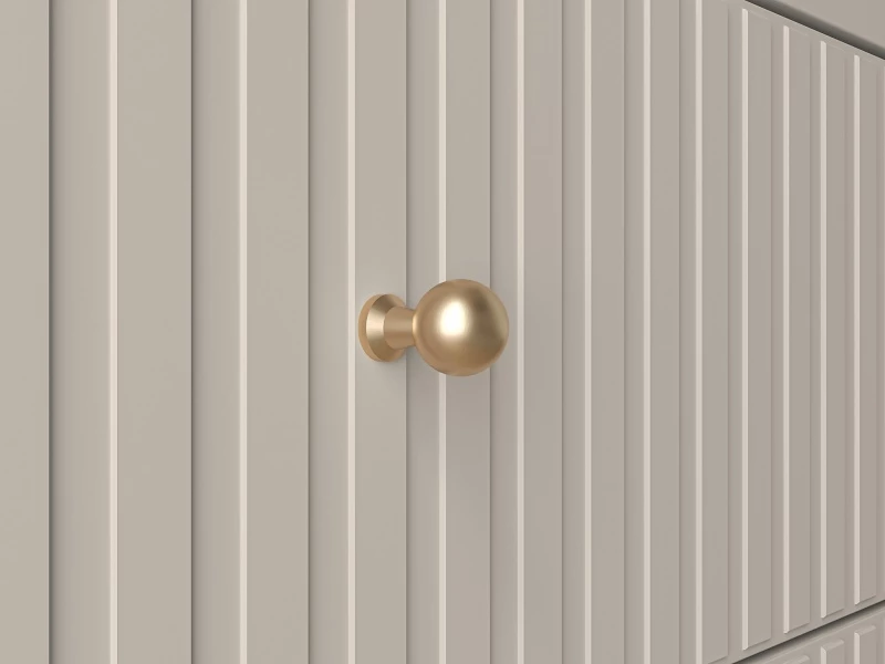 Meble z kolekcji Sophie to idealny wybór do współczesnego salonu, sypialni czy przedpokoju. Dzięki systemowi złożonemu z wielu brył urządzisz swoje wymarzone wnętrze. Kaszmirowy dekor to niebanalny i ponadczasowy kolor, nazywany nowym białym. Frezowane fronty MDF podkreślają wyrafinowanie i elegancję całej kolekcji. Dyskretne czarne nóżki dodają bryłom efektownej lekkości. Kropką nad i, dodatkowo budującą estetykę wszystkich mebli Sophie są uchwyty ze szczotkowanego metalu, w złotym wybarwieniu.